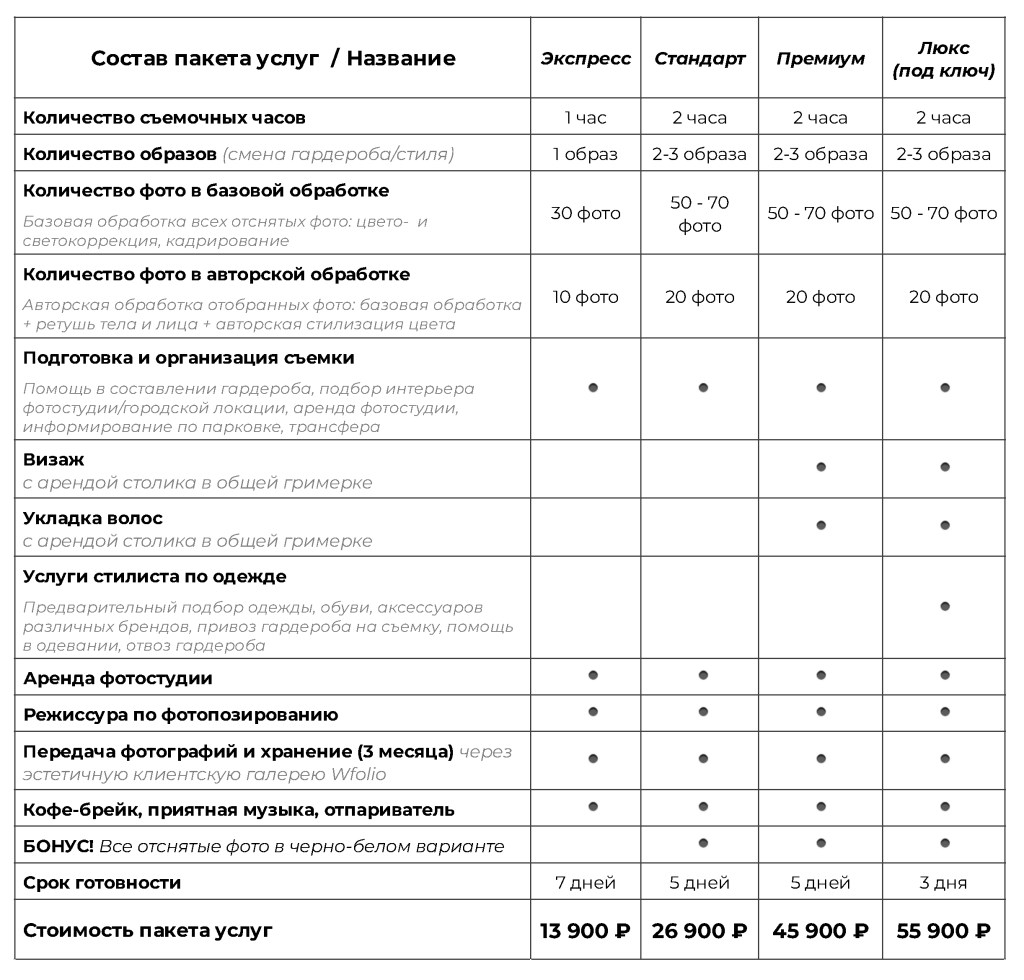 - Авторскую обработку фото сверх количества фотографий, чем в пакете услуг.
